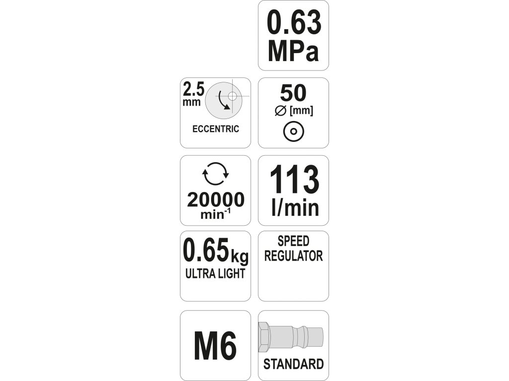 Umožňuje broušení a leštění různých materiálů pomocí brusných kotoučků o průměru 50 mm. Bruska je vhodná k profesionálnímu použití v garážích a servisech. Nabízí plynule regulovatelnou rychlost a max. 20000 ot/min a 2,5 mm oscilaci pro optimální úpravu povrchu.