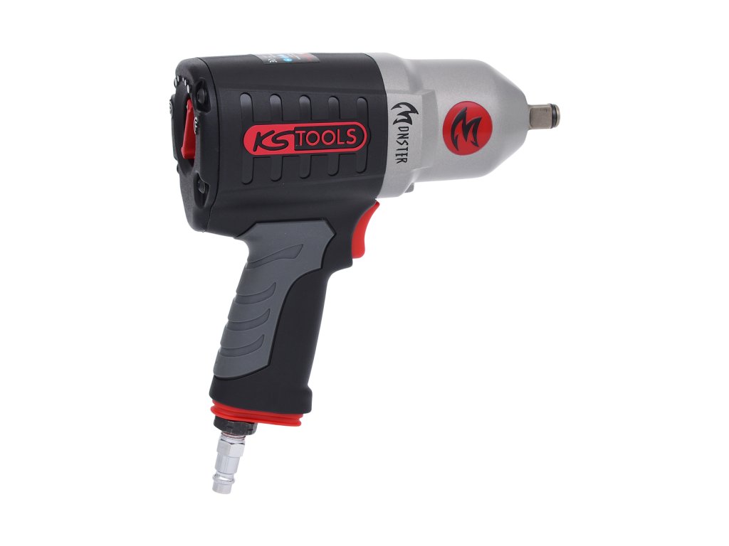 Výkonný pneumatický rázový utahovák KS Tools Monster s dvojitým vnitřním úderovým mechanismem (“twin-hammer“). Lehké hliníkové tělo (2,15 kg) s měkkým, tepelně odizolovaným gumovým madlem.