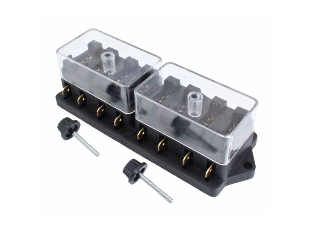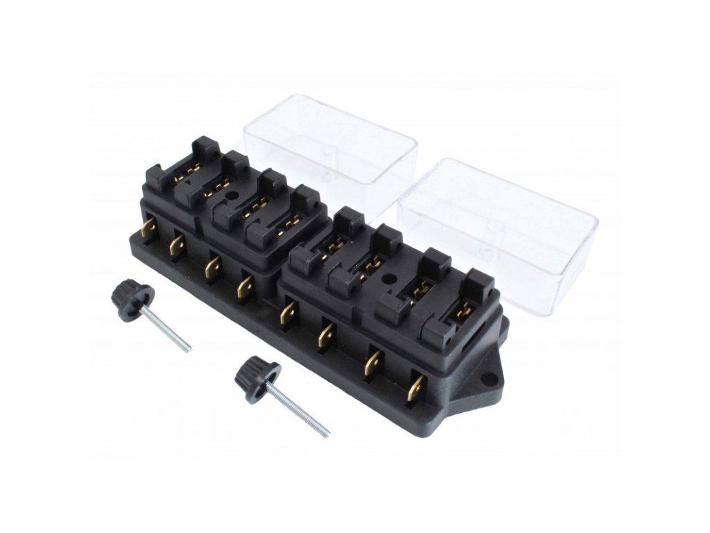 Pojistková skříňka pro montáž do elektroinstalace vozidel se šesti místy. Snadná kontrola pojistek díky průhledným překrytům – při prohlížení není třeba jejich demontáže, v případě výměny stačí odstranit kryt jen nad spálenou pojistkou (pokud není více vadných kusů v obou částech). Víka se snadno a rychle zajišťují pomocí šroubu.