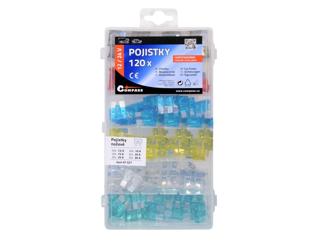 Celkem 120 pojistek v přehledném, přihrádkami opatřeném kufříku. Pojistky jsou určeny pro napětí do 50 V a jsou certifikovány, materiál zinek v kombinaci s plastem.