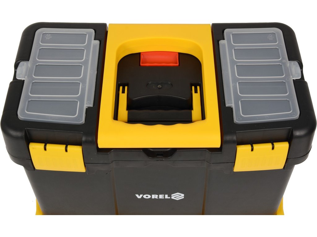 Vrchní organizér s přihrádkami je možné odepnout, tím je umožněno volně jej přenášet společně s nejnutnějším nářadím.