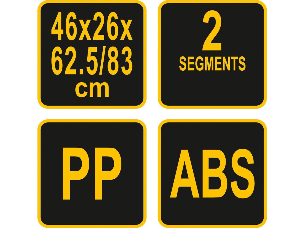 Vyrobeno z plastu s rozměry 46 x 26 x 62,5 (83) cm odolného proti mechanickému poškození.