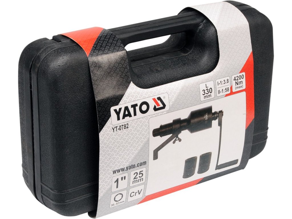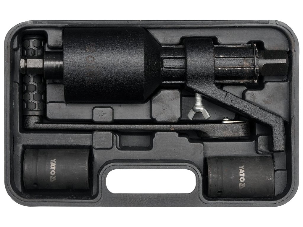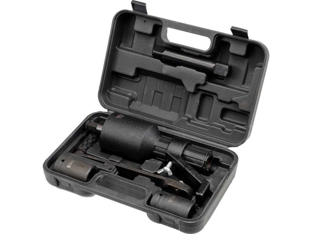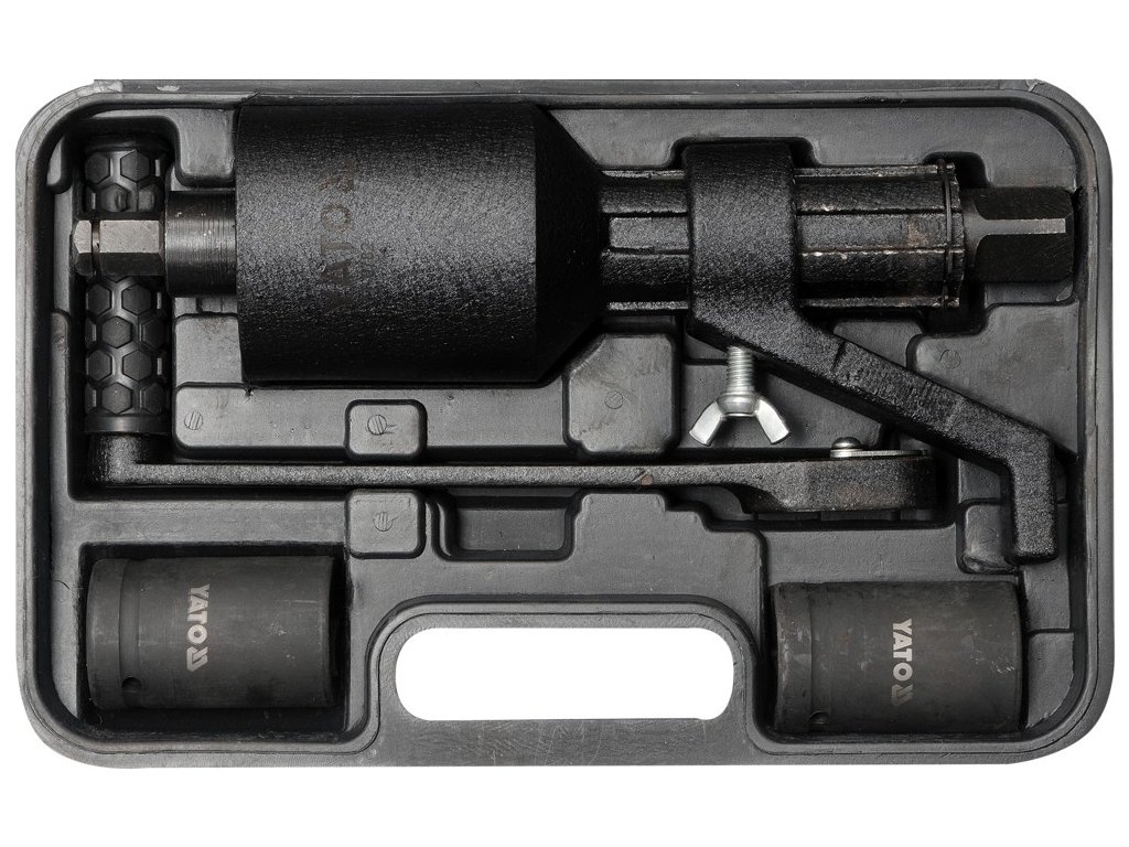 Sada je uložena v kufru, kde se nachází spolu s kovanými nástavci velikosti 32 a 33 mm, je tedy možné použít i pro sundavání kol nákladních automobilů.