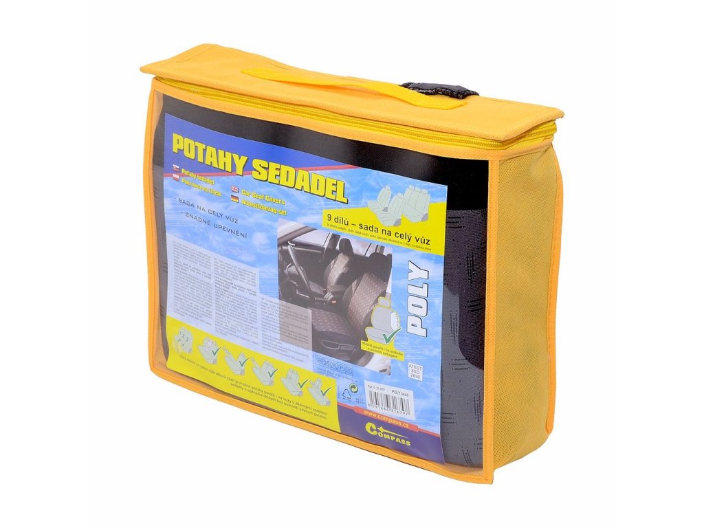 Potahy sedadel "POLY", sada na celý vůz. Lze připevnit na většinu běžně používaných automobilových sedadel. Potah lze použít na sedadlech, která mají zabudovaný boční airbag přímo v opěradle předních sedadel. Balení obsahuje potah na přední sedadlo (2x), zadní sedák (celý), zadní opěradlo (pomocí zipu dělitelné na 3 díly), opěrku hlavy (5x). Díky zipům na zadní opěradlové části je možné potahy použít i na vozy s dělenými zadními sedadly a opěradla sklápět bez nutnosti sejmutí potahu.