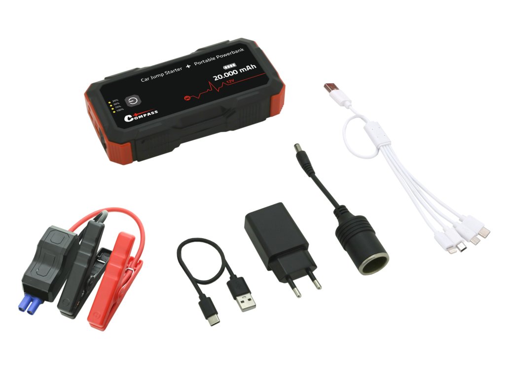 Powerbanka s kapacitou 20.000mAh s rychlým nabíjením a funkcí nouzového startování vozidla pomocí Smart klipsů.