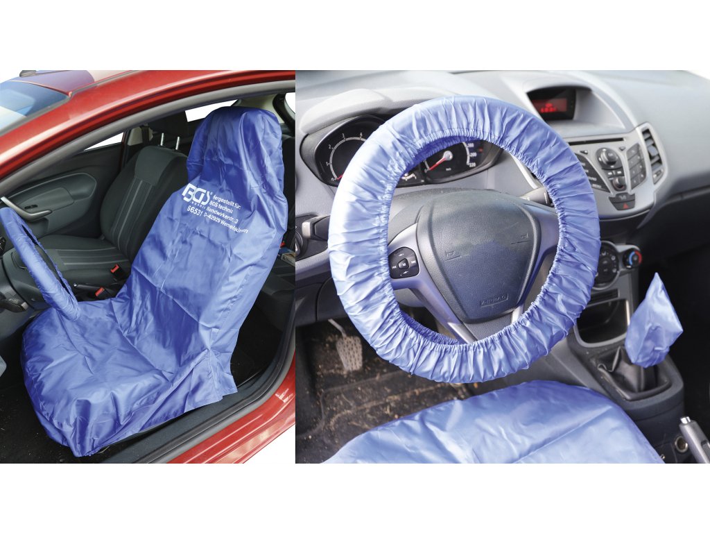 Sada pracovních potahů pro interiér auta BGS technic 66531 Komplet obsahuje potah - přehoz na přední sedadlo, volant a hlavici řadicí páky. Ideální především pro autoservis, kde hrozí při práci riziko znečištění vnitřku auta olejem, mazadly, různými kapalinami apod. Vyrobeno z odolného a snadno očistitelného polyesteru.Doplňkové parametry