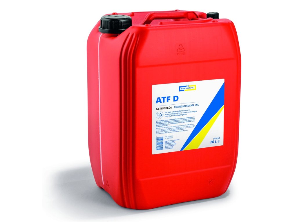 Univerzální převodový olej a hydraulická kapalina, balení různých objemů – Cartechnic ATF D Náplň do automatických i manuálních převodovek, posilovačů řízení a měničů točivého momentu. Vysoce kvalitní kapalina s tepelnou a oxidační stabilitou. Díky svému složení nepění a má velmi nízký od tuhnutí. Je neutrální vůči kovům a těsněním. Specifikace: - DEXRON IID - Allison C4 - Denison - Ford ESP-M2C 166-H - Ford Mercon - GM-Dexron - MAN 339 Typ L2 / V1 / Z1 - Voith H55.6335.XX (G 607) - MB 236,6 - ZF TE-ML 04D / 09 / 11A / 14A Fyzikální vlastnosti: Hustota při 15 ° C: 0,875 g / cm3 Viskozita při 40 ° C: 46,0 mm2 / s Viskozita při 100 ° C: 8,3 mm2 / s Bod plamene: 206 ° C Bod tuhnutí: -39 ° C Index viskozity (VI): 157 Červená barva Mísitelnost: kompatibilní se srovnatelnými oleji.Doplňkové parametry