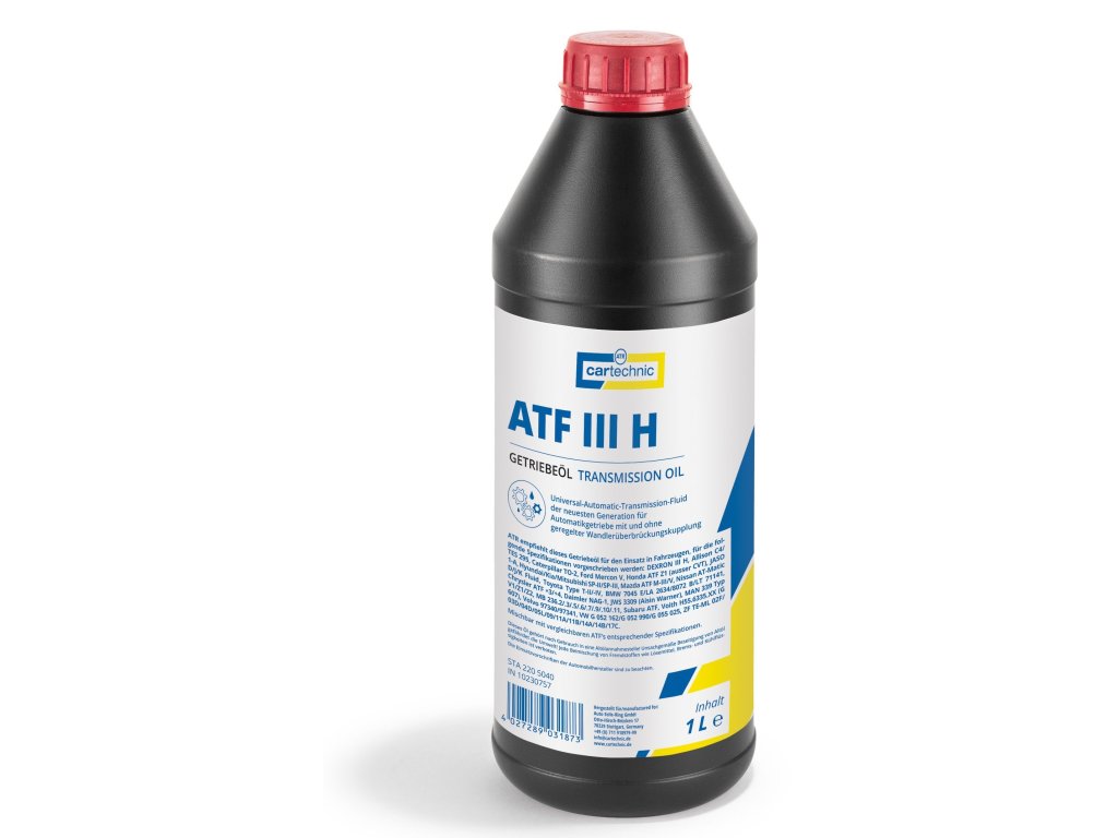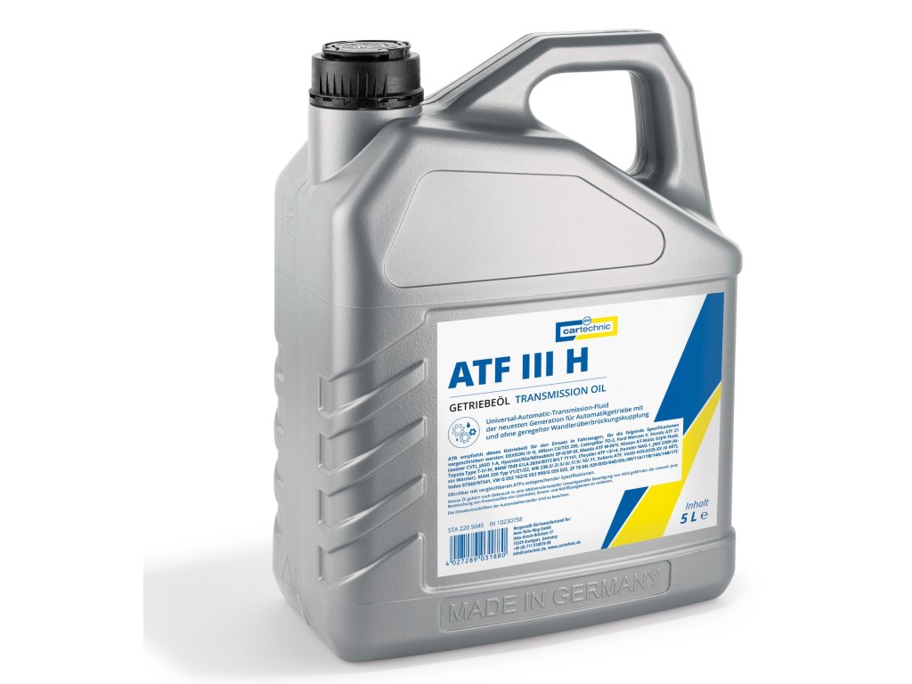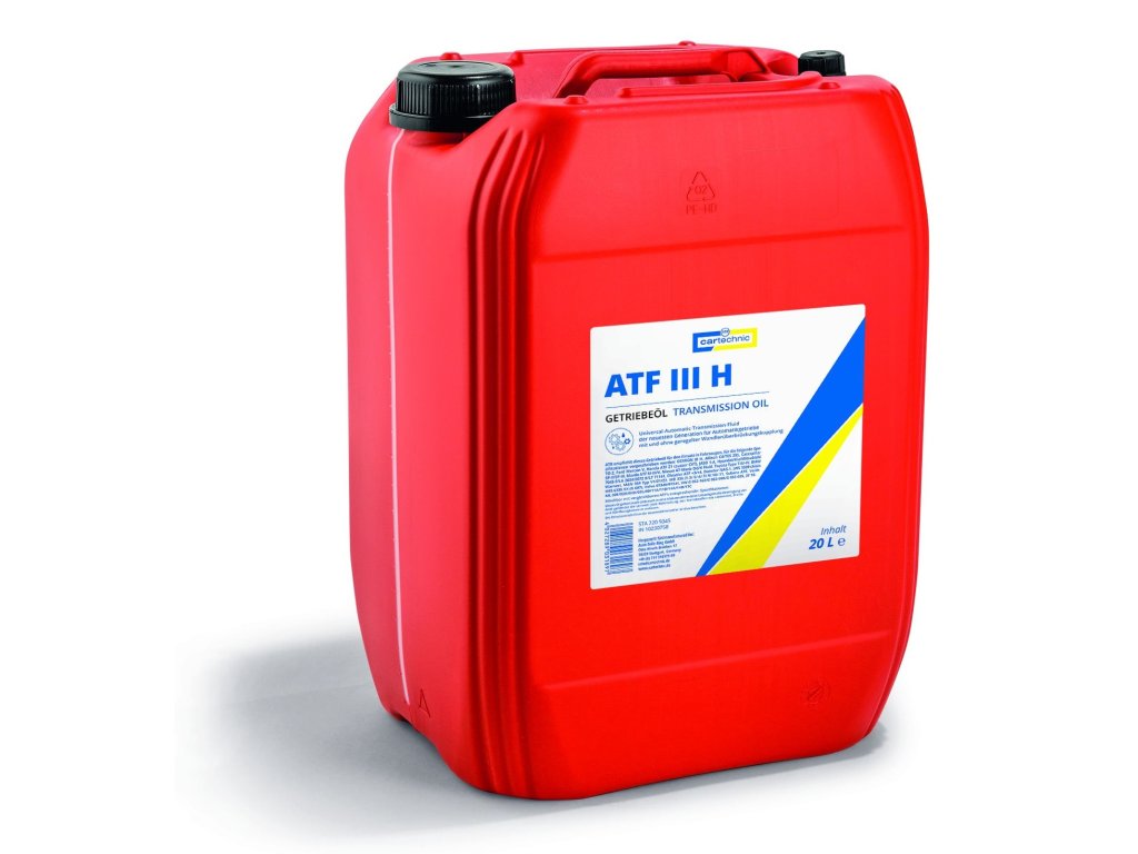 Univerzální olej a převodová kapalina pro osobní i užitkové automobily, balení různých objemů – Cartechnic ATF III H Kvalitní náplň pro automatické i manuální převodovky, posilovače řízení (tzv. servo), hydraulické systémy a pomocné pohony a další. Používá se pro osobní i užitková (nákladní) auta, průmyslové aplikace atd. Olej s velmi dobrými mazacími schopnostmi i při nízkých teplotách, s vysokou teplotní kapacitou. za všech provozních podmínek zaručuje maximální ochranu proti opotřebení. Spolehlivě chrání před usazováním kalů, korozí a lepením (tzv. šlem). Specifikace: - DEXRON III H - Allison C4 / TES 295 - Caterpillar TO-2 - Ford Mercon V - Honda ATF Z1 (ausser CVT) - JASO 1-A - Hyundai / Kia / Mitsubishi SP-II / SP-III - Mazda ATF M-III / V - Kapalina Nissan AT-Matic D / J / K. - Toyota Type T-II / -IV - BMW 7045 E / LA 2634/8072 B / LT 71141 - Chrysler ATF + 3 / + 4 - Daimler NAG-1 - JWS 3309 (Aisin Warner) - MAN 339 Typ V1 / Z1 / Z2 - MB 236.2 / .5 / .6 / .7 / .9 / .10 / .11 - Subaru ATF - Voith H55.6335.XX (G607) - Volvo 97340/97341 - VW G 052 162 / G 052 990 / G 055 025 - ZF TE-ML 02F / 03D / 04D / 05L / 09 / 11A / 11B / 14A / 14B / 17C Fyzikální charakteristiky: Hustota při 15 °C: 0,850 g/cm3 Viskozita při 40 °C: 36,4 mm2/s Viskozita při 100 °C: 6,9 mm2/s Bod plamene: 230 °C Bod tuhnutí: -48 °C Viskozitní index (VI): 150 Barva: červená Mísitelnost: kompatibilní se srovnatelnými oleji (nutno dodržovat pokyny výrobce).Doplňkové parametry