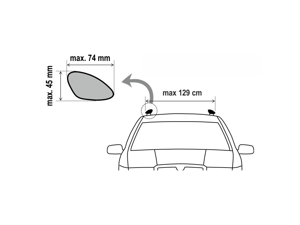 Příčník má délku 135 cm a je určen pro vozy s roztečí podélných nosičů až 129 cm a max. průřezem 45 x 74 mm.