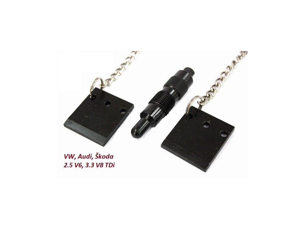 Rozvodový přípravek vhodný pro vznětové (dieselové) motory Volkswagen group (Audi, Škoda, Volkswagen) 2.5L TDi V6 poháněné řemenem od roku 1997, sada obsahuje pojistný kolík horní úvrati klikové hřídele a destičky pro nastavení vačkového hřídele.
