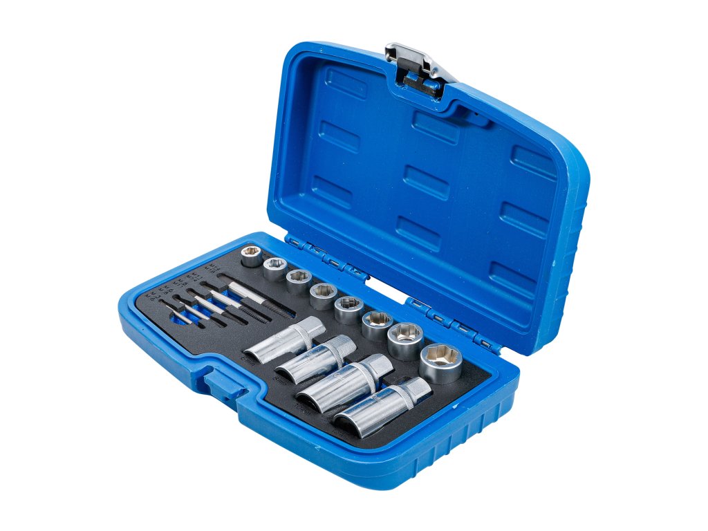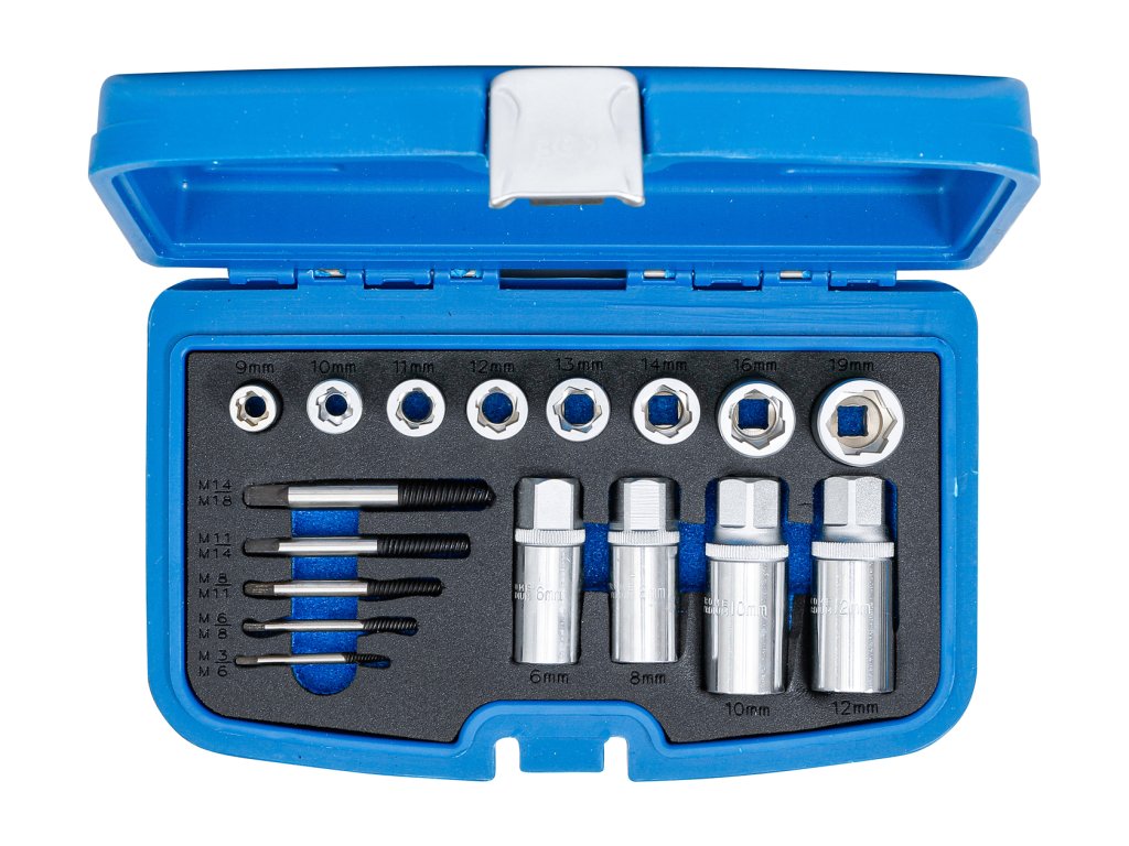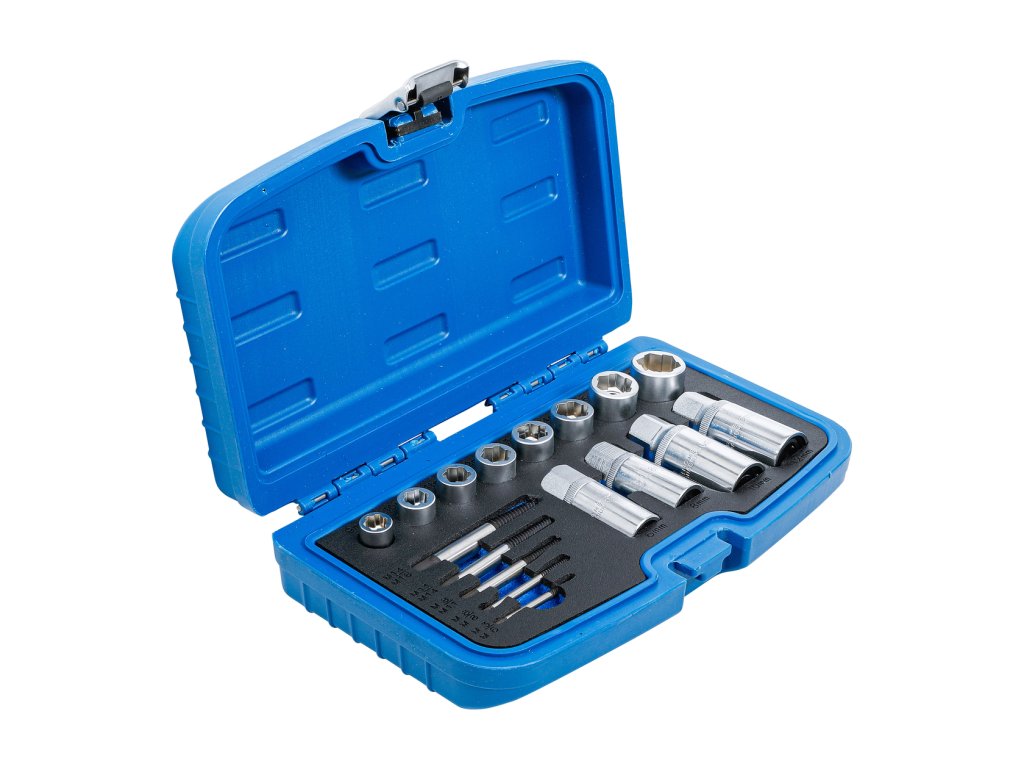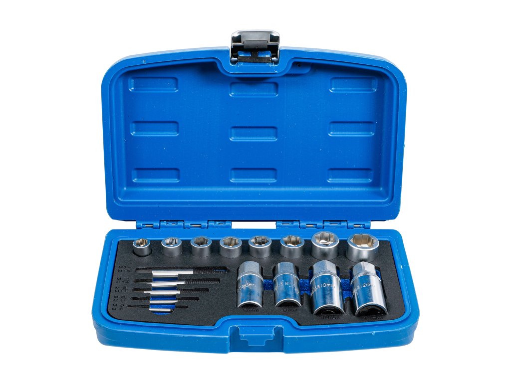 Praktická souprava nástrojů řeší problémy se zaoblenými nebo utrženými hlavami šroubů. Celkem 17 nástrojů je dodáváno v praktickém plastovém kufříku.