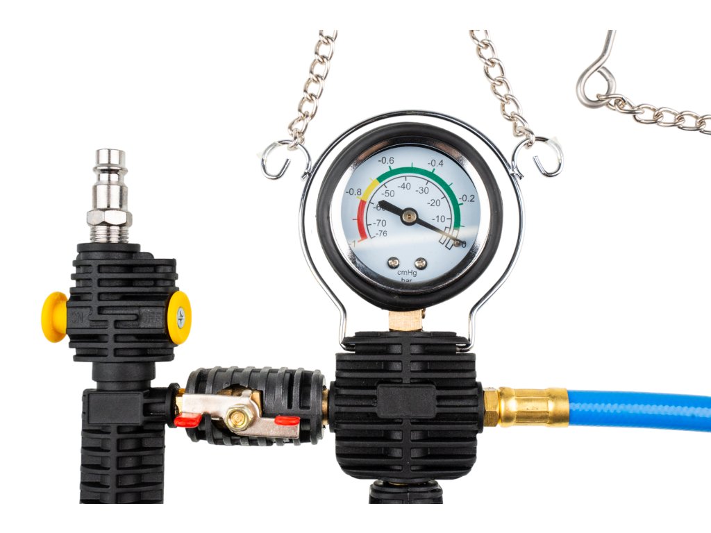 Přehledný manometr disponuje rozsahem hodnot -1 až 0 bar s desetinným odstupňováním.