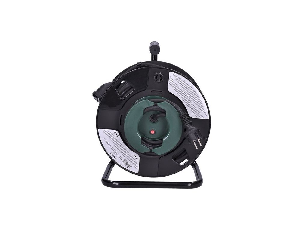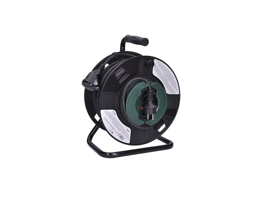 Prodlužovačka navíjecí na buben s gumovým kabelem, extra délka 50 metrů, 1 zásuvka, přímá vidlice – SOLIGHT PB31 Bytelná prodlužka s vysokým stupněm krytí, vhodná pro použití venku. Díky voděodolné konstrukci ji lze využívat i ve vlhkém či dočasně v mokrém prostředí – např. na zahradách, stavbách, ale i v servisech, dílnách a na dalších místech. 50metrová délka je vhodná pro vedení elektřiny i do oblastí vzdálenějších od zdroje – přívodní kabel (na boku bubnu) se připojí do zásuvky, prodlužovací potom přímo ke spotřebiči. Bezpečné použití: tepelná pojistka zabraňuje přehřátí při práci, zásuvka má ochranný odklápěcí kryt. Vybaveno dětskou ochranou (otvory zásuvek jsou zajištěny proti zastrčení předmětů). Snadno se navíjí díky malé rukojeti na boční straně bubnu, pohodlné přenášení pomocí velkého madla na vrchní straně. Černo-zelená barevná kombinace. Technická data: Délka: 50 m Průřez vodičů: 3 x 1,5 mm2 Typ kabelu: H05RR-F3 Zatížení: 4,3A/1000W navinutý; 13A/3000W rozvinutý Stupeň krytí: IP44 – ochrana před vniknutím předmětů s průměrem nad 1 mm (před nástrojem, drátem nad 1 mm), odolné vůči stříkající vodě ze všech směrů v množství 10 l/min. po dobu 5 minutDoplňkové parametry