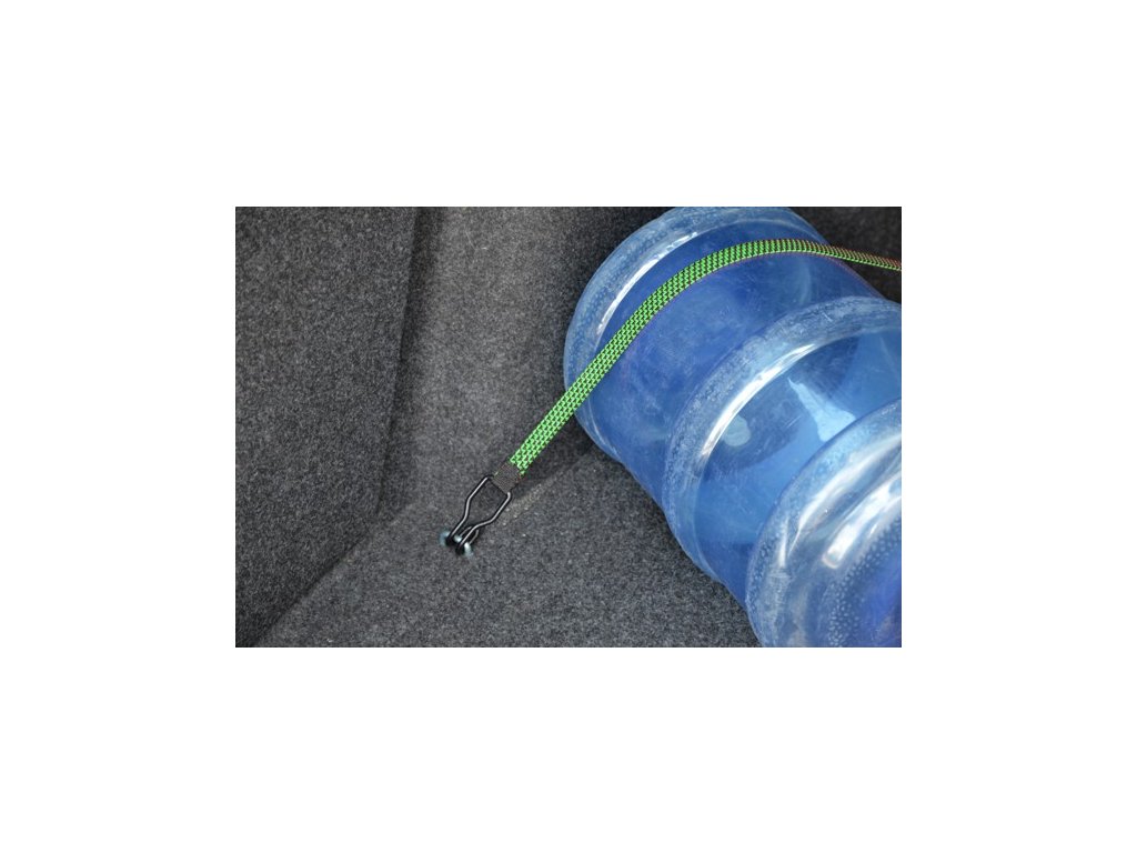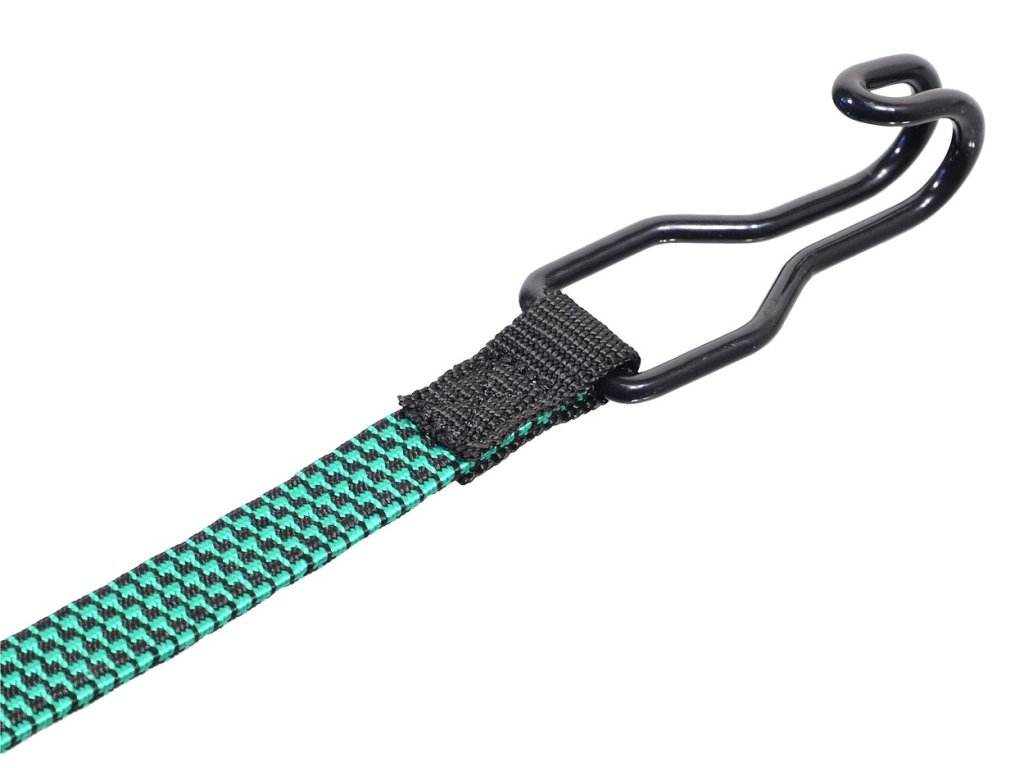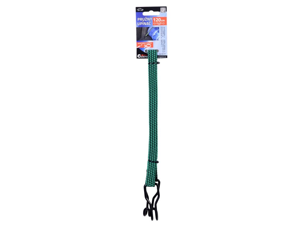 Pružný upínač plochého průřezu zakončený dvěma kovovými háky.