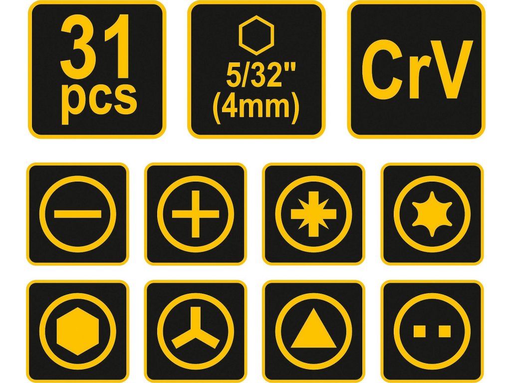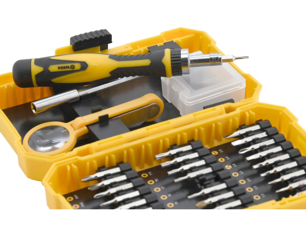 Nářadí je precizně zpracováno z CrV oceli a jednotlivé nástavce 5/32"(4 mm) jsou magnetické, čímž usnadňují práci se součástkami. Šroubovák s ráčnovým mechanismem je opatřen pojistkou, bránící vypadnutí nástroje. V sadě se dále nachází krabička pro ukládání drobných součástek a nástroj složený z držáku a lupy, pro lehké a rychlé zkoumání drobných součástí a jejich případných vad.