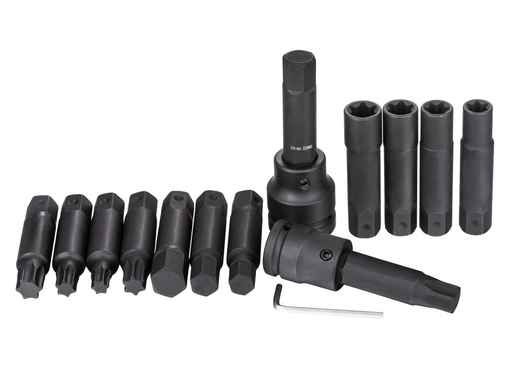Sada úderových bitů 22 mm QUATROS QS50472 Souprava obsahuje: TORX T60, T70, T80, T90, T100 délka (délka 107 mm) Imbus 17 mm, 19 mm, 22 mm, 24 mm (délka 107 mm) TORX-E E18, E20, E22, E24 (délka 107 mm) Držáky na bity 22mm na čtyřhran 3“ a 1“ Imbus 4 mm pro zajištění bitů v držáku. Kvalitní produkt: vyrobeno z chrom-molybdenové oceli (CrMo).Doplňkové parametry