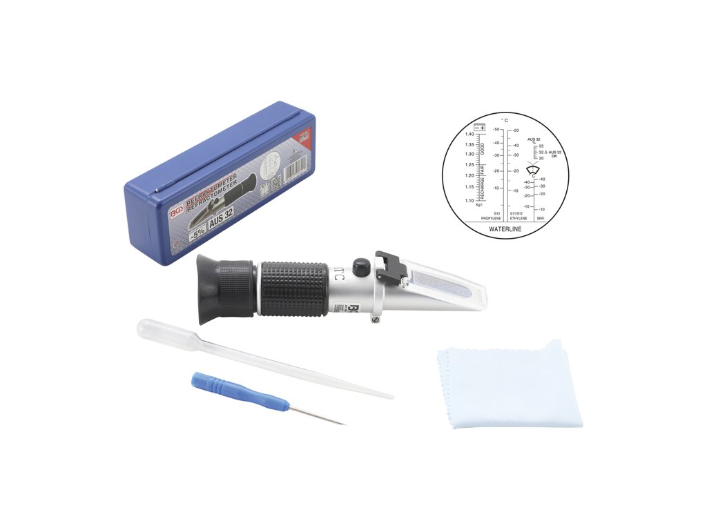 Speciální kontrolní přístroj na stanovení fyzikálních vlastností kapaliny měřením indexu lomu na hranici média. Přístrojem je určit hodnotu kyseliny autobaterie, teplotu tuhnutí chladících kapalin na bázi propylenglykolu nebo ethylenglykolu, teplotu tuhnutí kapalin do ostřikovačů a taktéž koncentraci aditiva AdBlue.