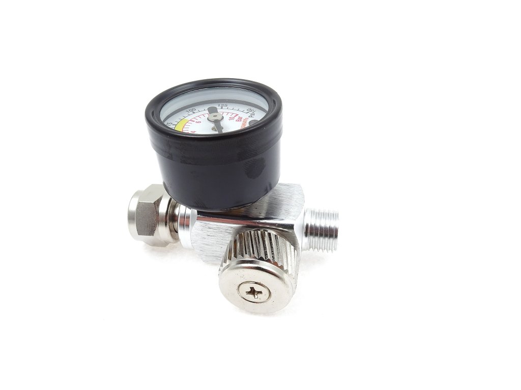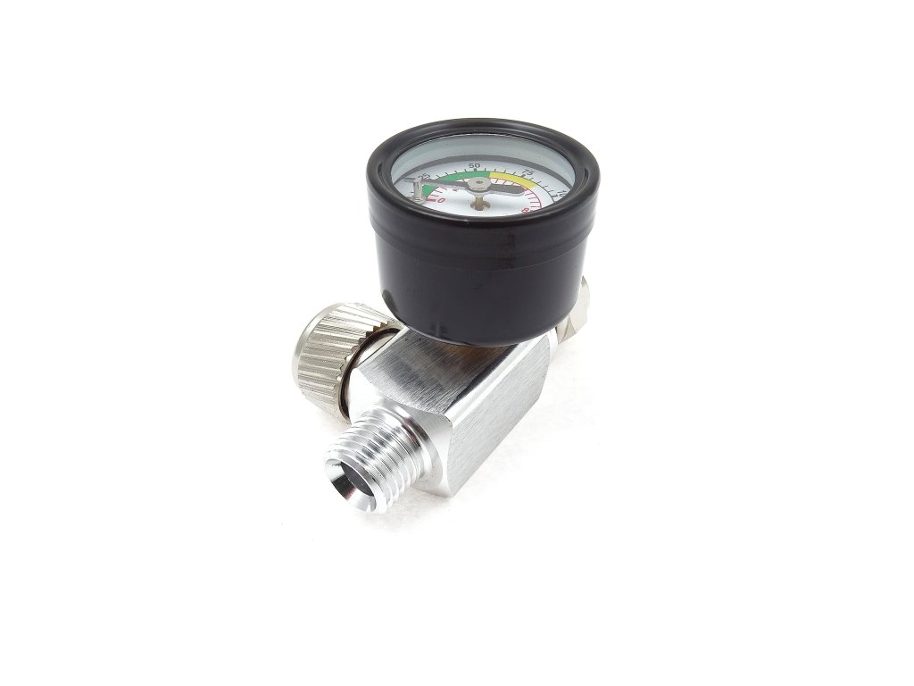 Malý regulátor tlaku 0-10 bar s 1/4” závity na obou koncích. Dobře čitelná stupnice pro snadnou orientaci. Tlak se nastavuje otočným knoflíkem na straně regulátoru.