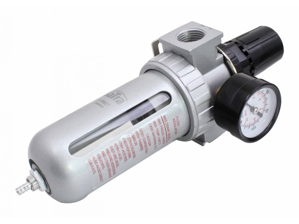 Kombinovaný regulátor stlačeného vzduchu s odlučovačem vody, pro pneumatické nářadí, připojení 1/2", maximální tlak 10 bar – SATRA S-FR817