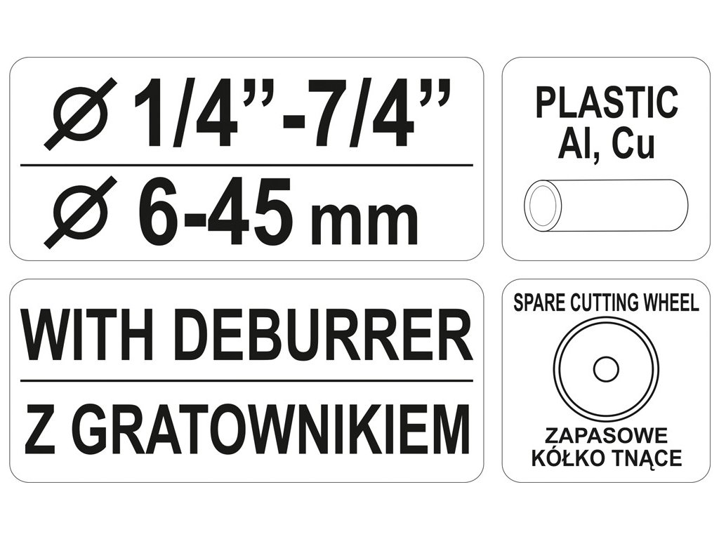 Řezač je vhodný pro různé průměry trubek 1/4" - 7/4" (6 - 45 mm).