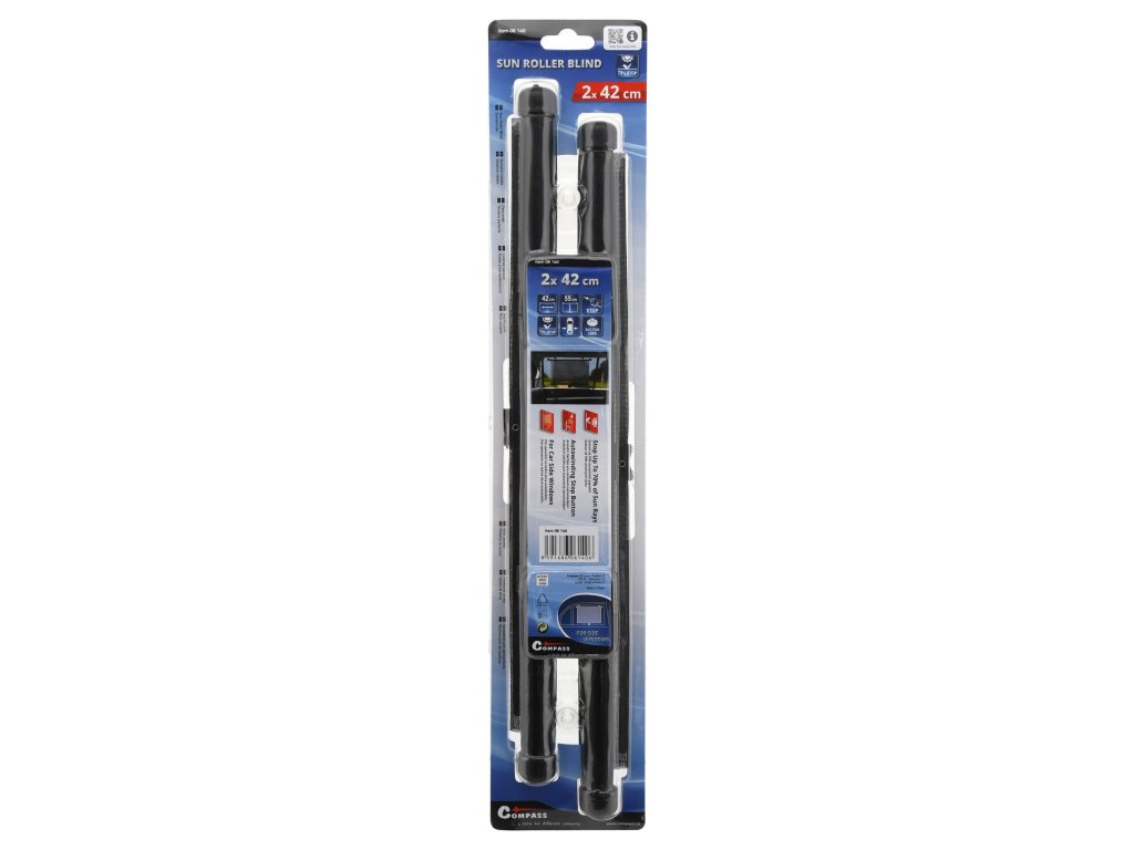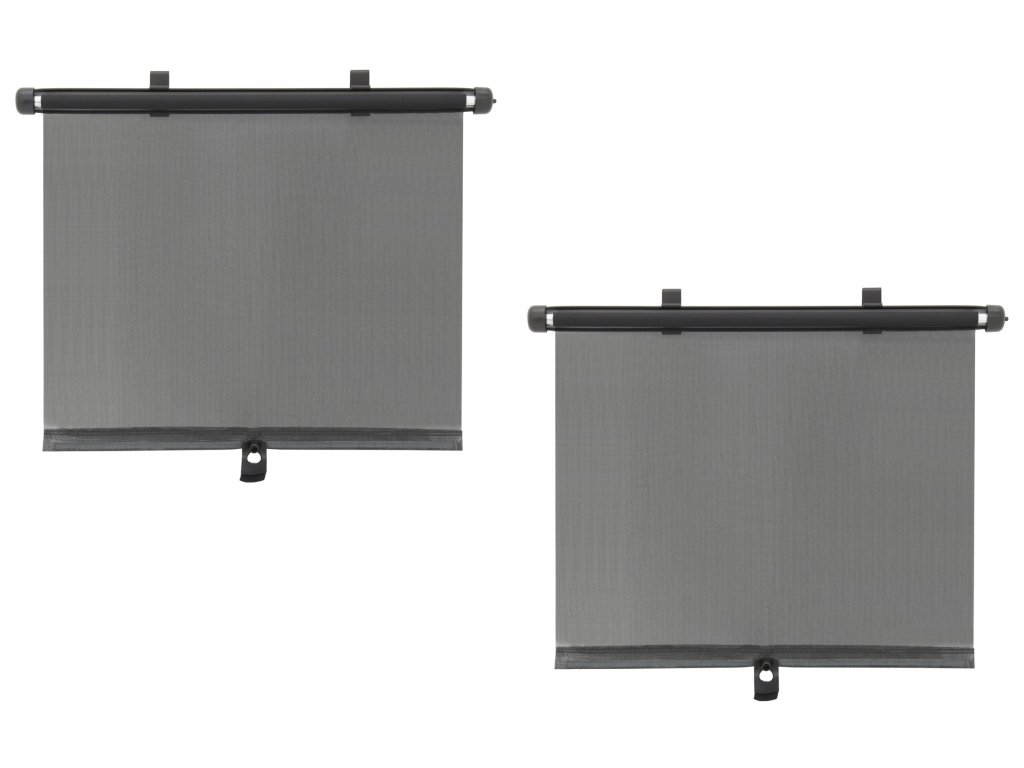 Určeno k montáži na zadní boční okna automobilu, připevnění nasunutím na horní hranu bočního okna, nebo přiloženými přísavkami. Roletku lze ve vysunuté poloze fixovat zaháknutím za přísavku a použitím aretace. Způsob perforace materiálu zajišťuje absorpci cca 70% slunečních paprsků Materiál polyester, sada 2 ks, s přísavkami, Velikost vytažené roletky 42 x 55 cm, šířka celé roletky včetně uchycení: 46 cm.