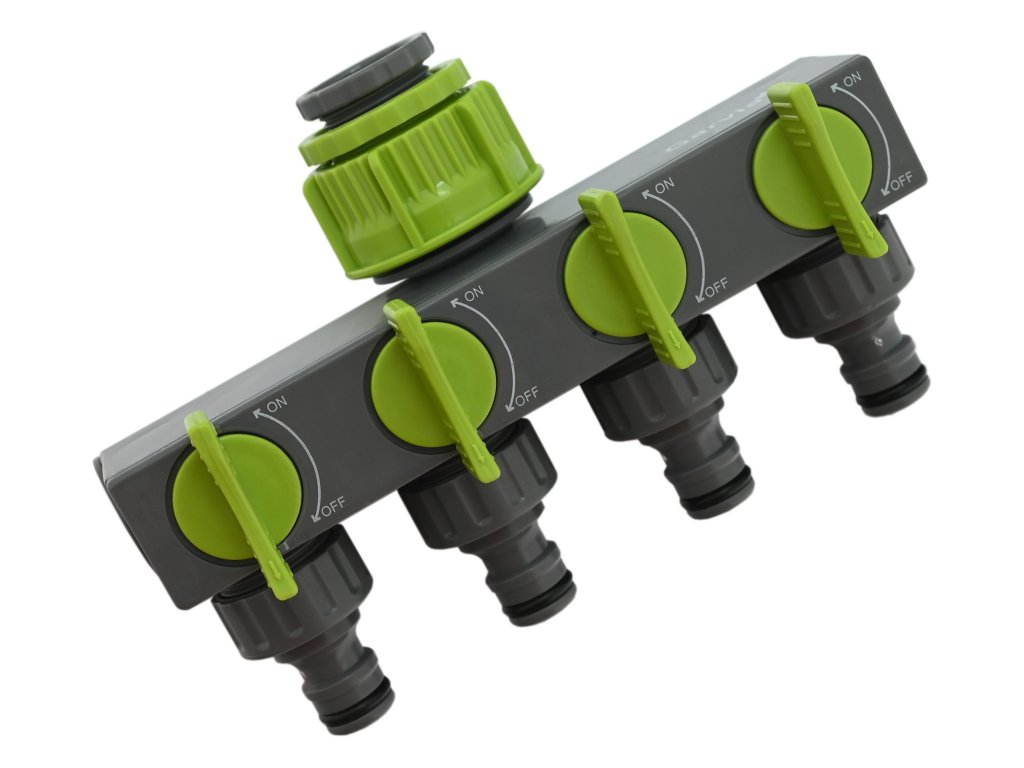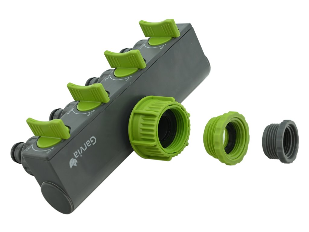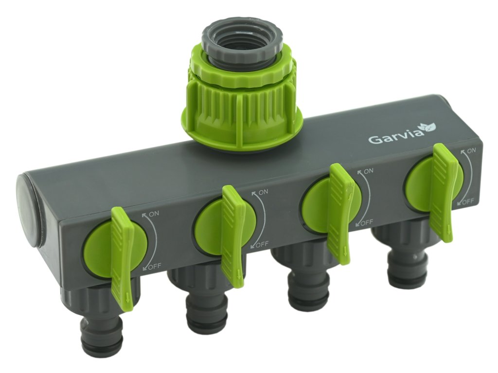 Rozdělovač umožňuje připojení až čtyř zahradních hadic opatřených rychlospojkou CLICK k jednomu kohoutku (G1/2", G3/4" nebo G1") a poskytuje individuální kontrolu průtoku vody.