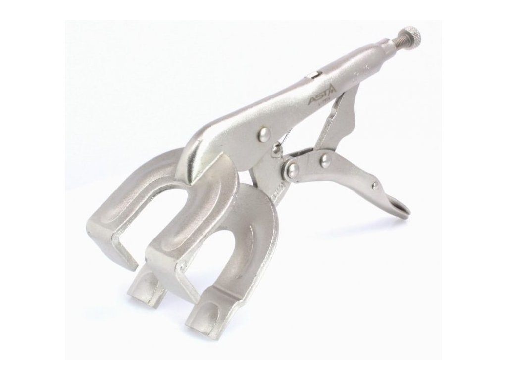 Rychloupínací samosvorné kleště „grip“, délka 230 mm, s čelistmi W-profilu pro karosářské práce – ASTA A-TW09 Speciální nářadí se zajištěním pomocí šroubu a uvolněním pákou. Používá se např. při svařování, bodování a dalších pracích v autokarosářských nebo zámečnických dílnách. Kováno z chrom-molybdenové (Cr-Mo) oceli, poniklovaný povrch.Doplňkové parametry