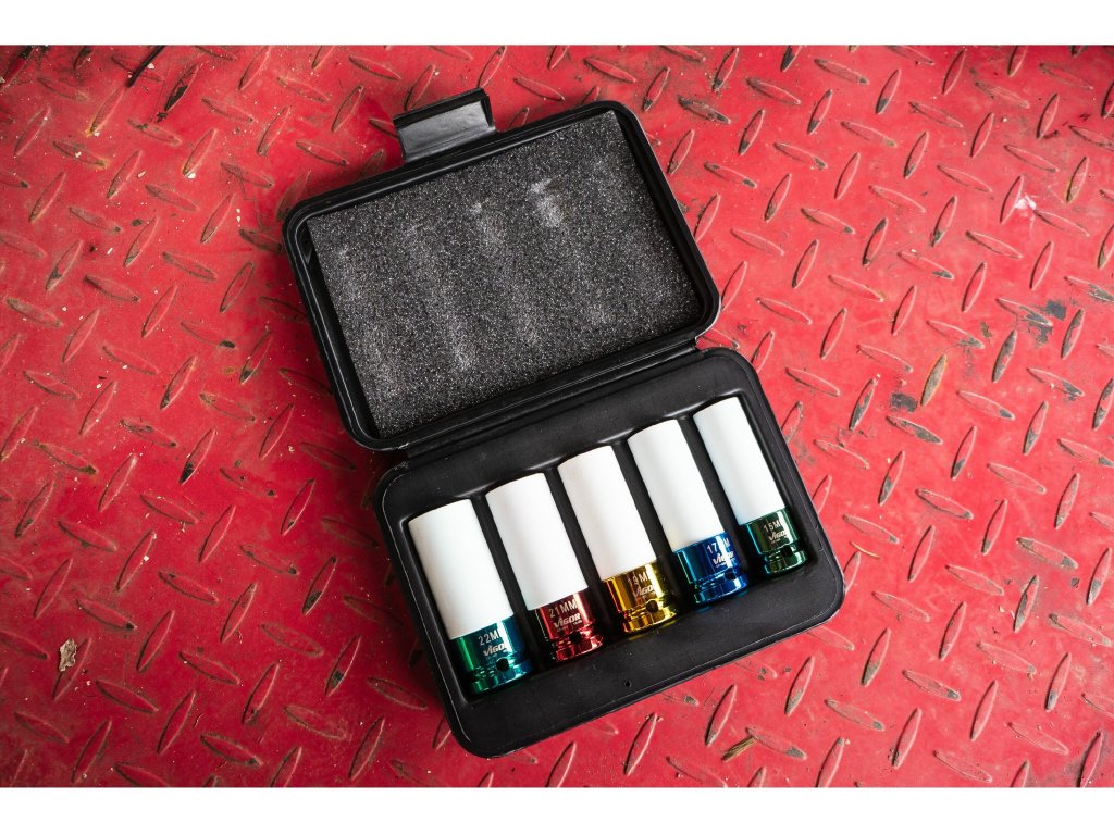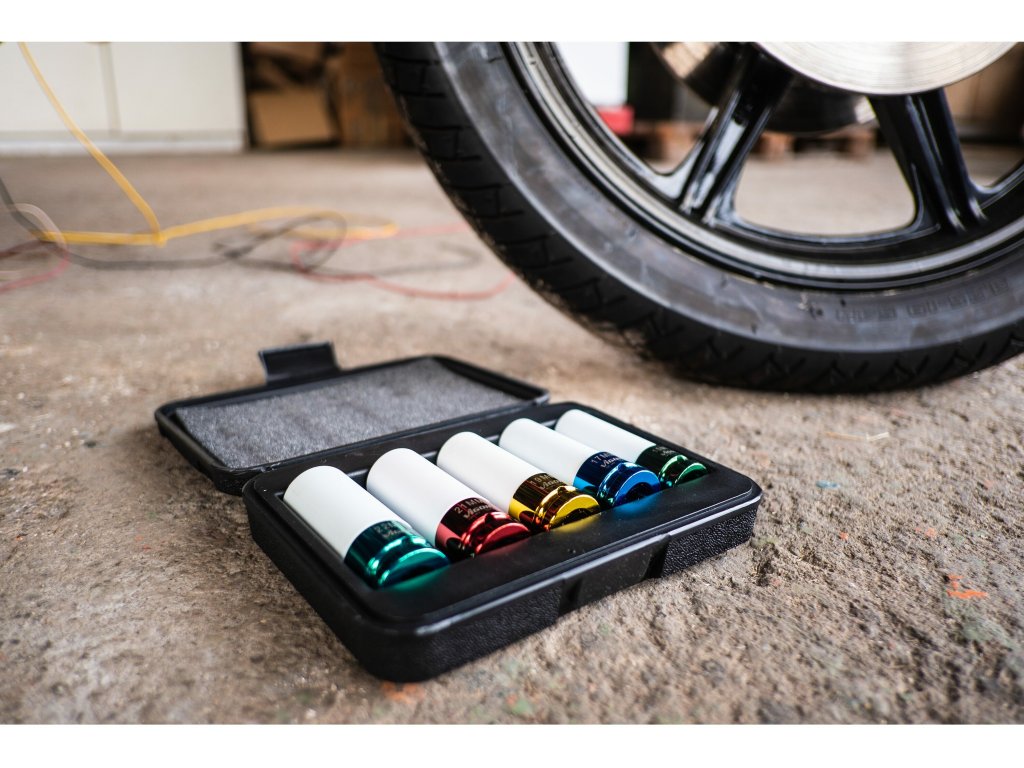 5-dílná sada speciálních kovaných hlavic 1/2“ na hliníkové disky v plastovém kufříku obsahuje hlavice 15/17/19/21/22 mm.