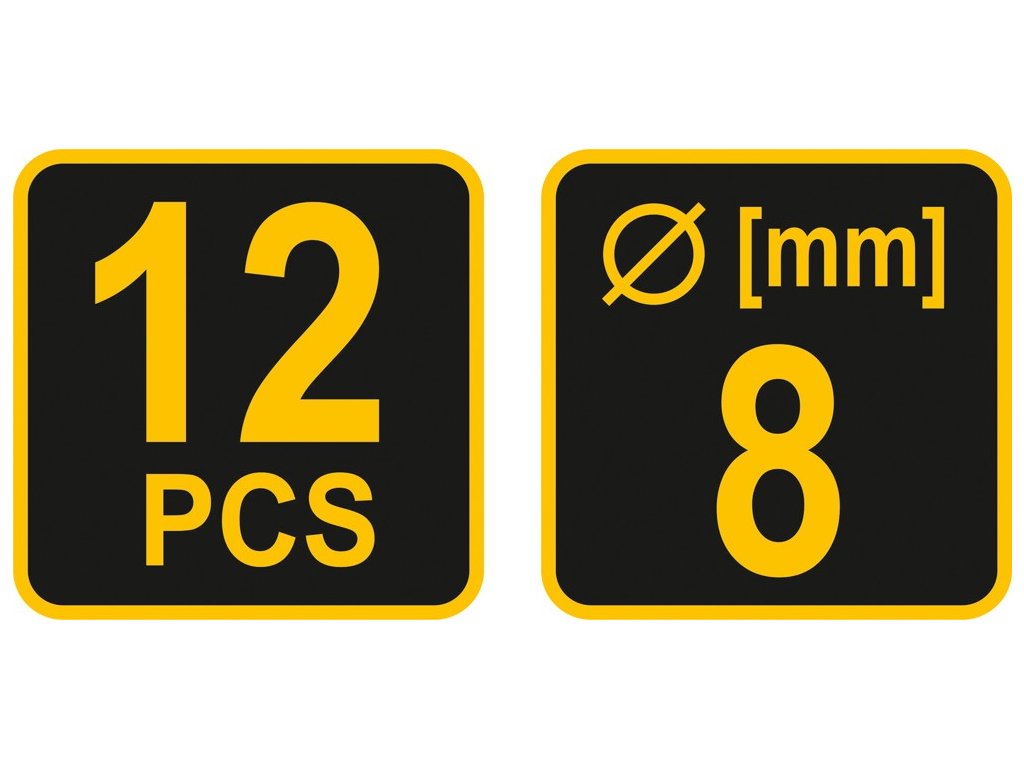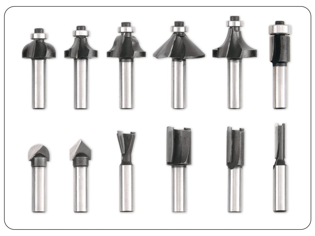 Sada dvanácti různých tvarových frézek pro měkké i tvrdé dřevo, překližku a dřevotřískové desky.