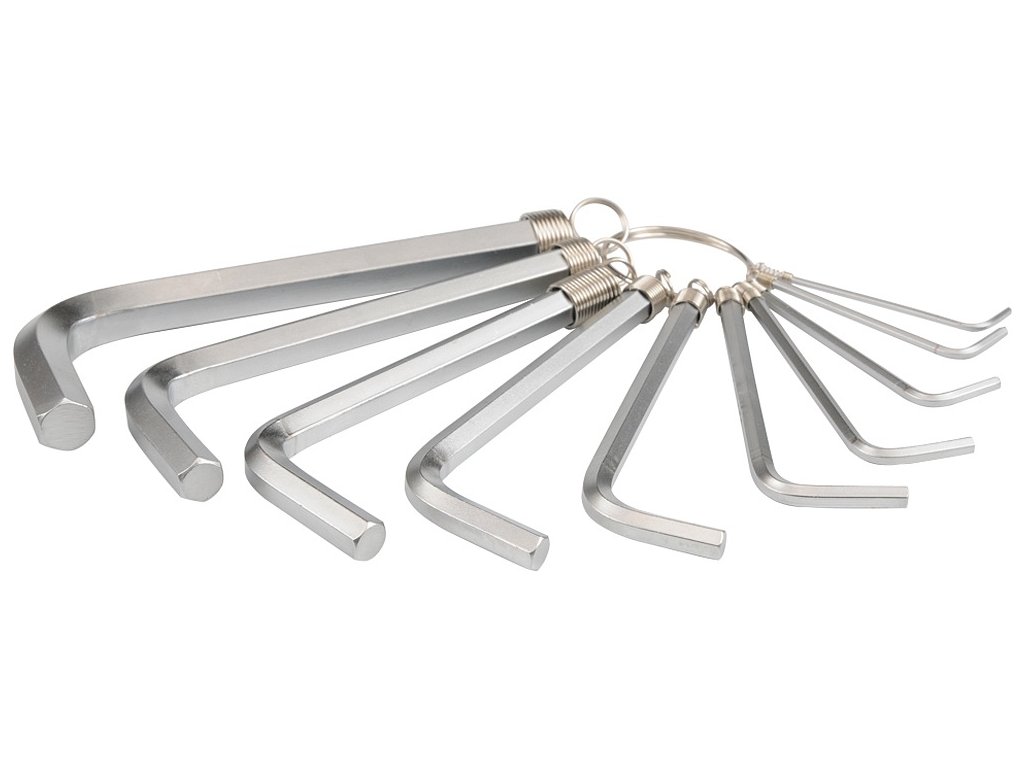 Sada 10 ks imbusových klíčů běžných rozměrů, zavěšených pomocí pružinek na kroužku.