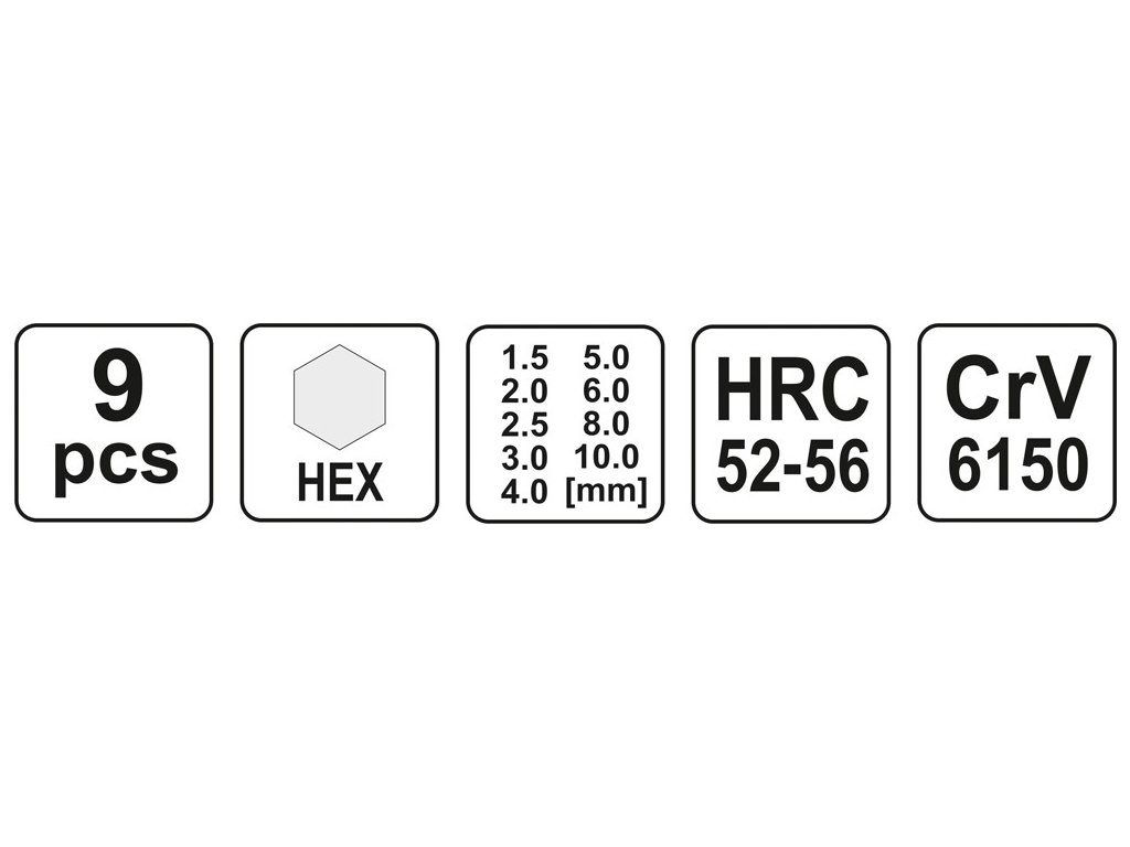 Jednotlivé klíče jsou zhotovené z kvalitní chromvanadiové slitiny oceli CrV 6150, zajišťující dlouhou životnost a korozivzdornost. Díky zvolenému materiálu je tvrdost jednotlivých imbusových klíčů HRC 52-55.