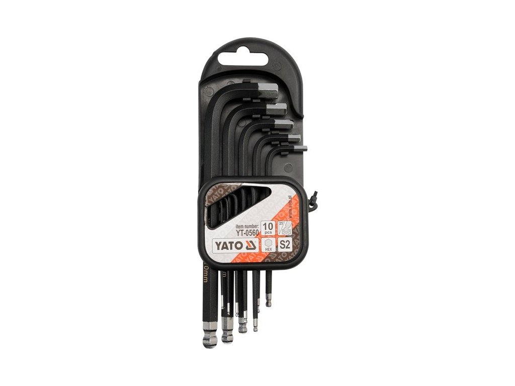 Sada 10 ks delších imbusových klíčů běžných rozměrů s kuličkou, uložených v přehledném, plastovém držáku.
