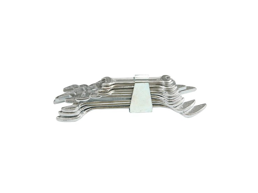 Sada klíčů s dvojitým otevřeným koncem 6 - 22 mm. Vyrobeno z uhlíkové oceli. Klíčové hlavy sklopené o 15 stupňů.