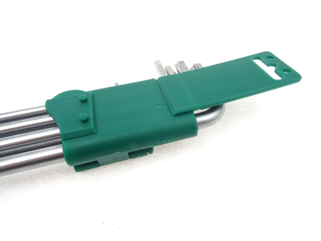 Souprava deseti TORX klíčů s otvorem (profil Torx Anti Tamper – TT) v praktickém plastovém organizéru, který lze pro snadný přístup ke klíčům rozevřít, zavěsit na zeď (např. na dílenskou stěnu), nebo zacvaknout za opasek. Klíče tak mohou být vždy po ruce při práci.