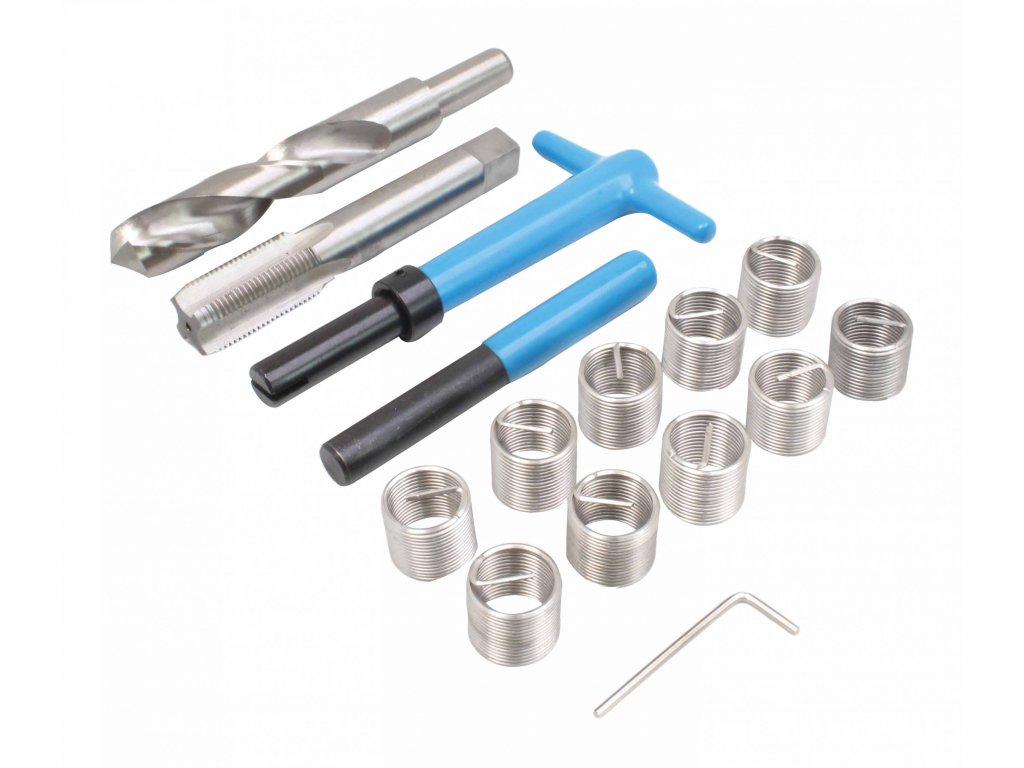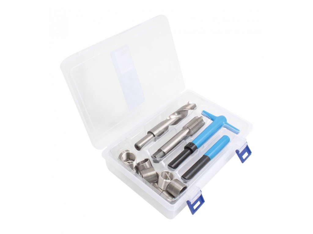Sada je určena pro opravu zlomených a poškozených závitů M20 x 1,5 mm. Příslušenství obsahuje závitník a vrták, vratidlo, vyrážeč a sadu spirálových vložek.