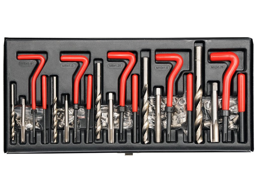 Opravná sada poškozených metrických závitů je určena všude tam, kde při poškození závitu nelze použít šroub jiného rozměru, než byl původní. Dále lze závitové vložky využít pro výztuhu závitů v materiálech s nízkou pevností ve střihu např. alu nebo hořčíkové slitiny. Obsahem sady pro každý druh závitu je vrták, závitník, zavádeč, vyrážecí trn a závitové vložky z nerezové oceli. Vložky M5 – M10 jsou v balení 25 kusů, vložky M12 v balení 10 kusů..