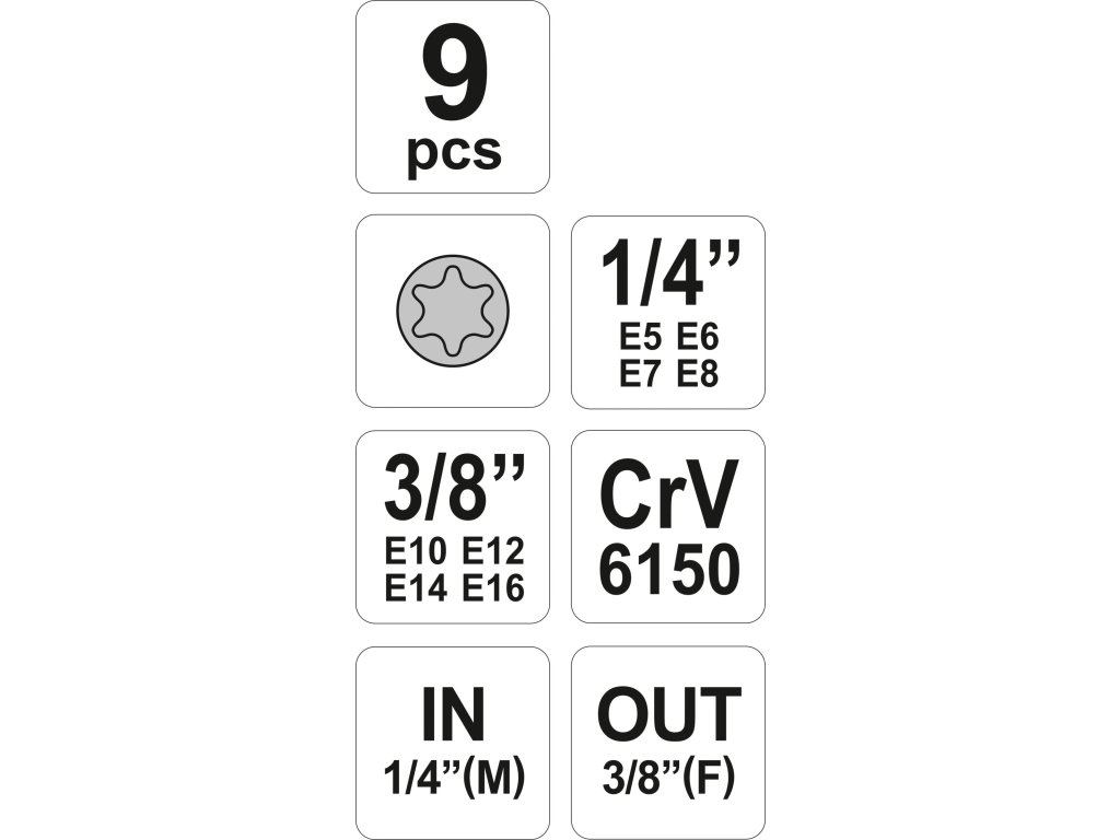 Sada nástavců 1/4", 3/8" TORX 9 ks E5-E16