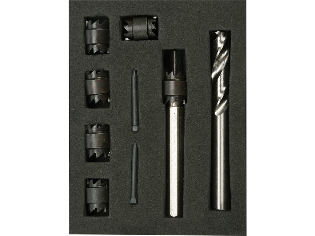 Sada je složena z 6 oboustranných řezačů průměru 10 mm, upínací rukojeti, 3 upevňovacích šroubů a speciálního HSS vrtáku průměru 8 mm.