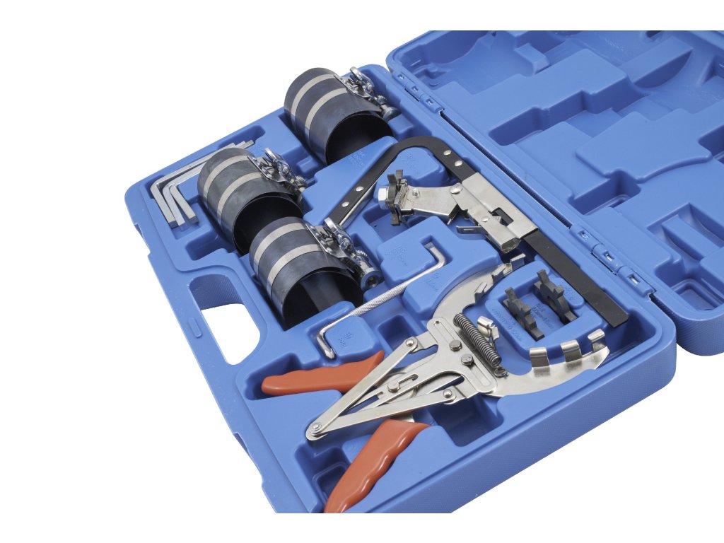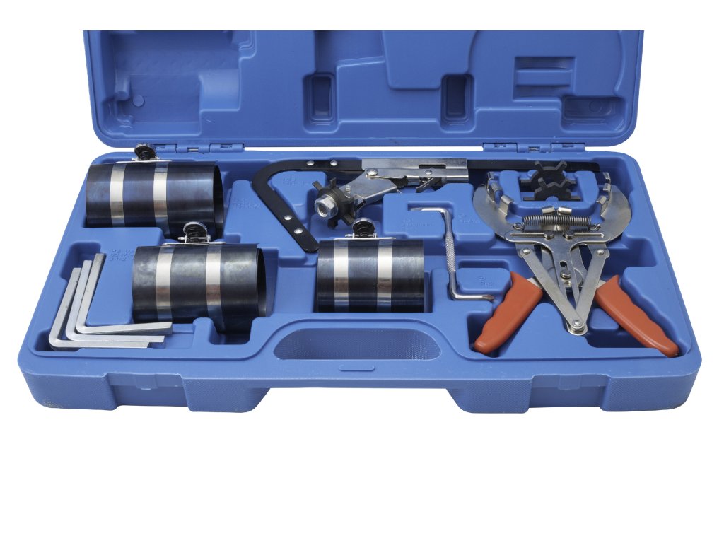 Ucelený set pro práci s pístními kroužky motoru. Umožňuje např. jejich výměnu, čištění drážek od usazenin, pohodlné a bezpečné vsazení pístu do válce apod.