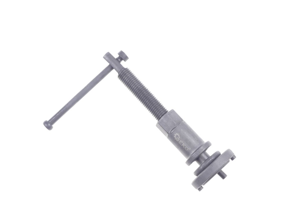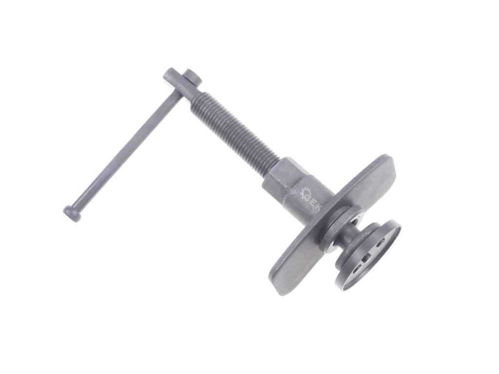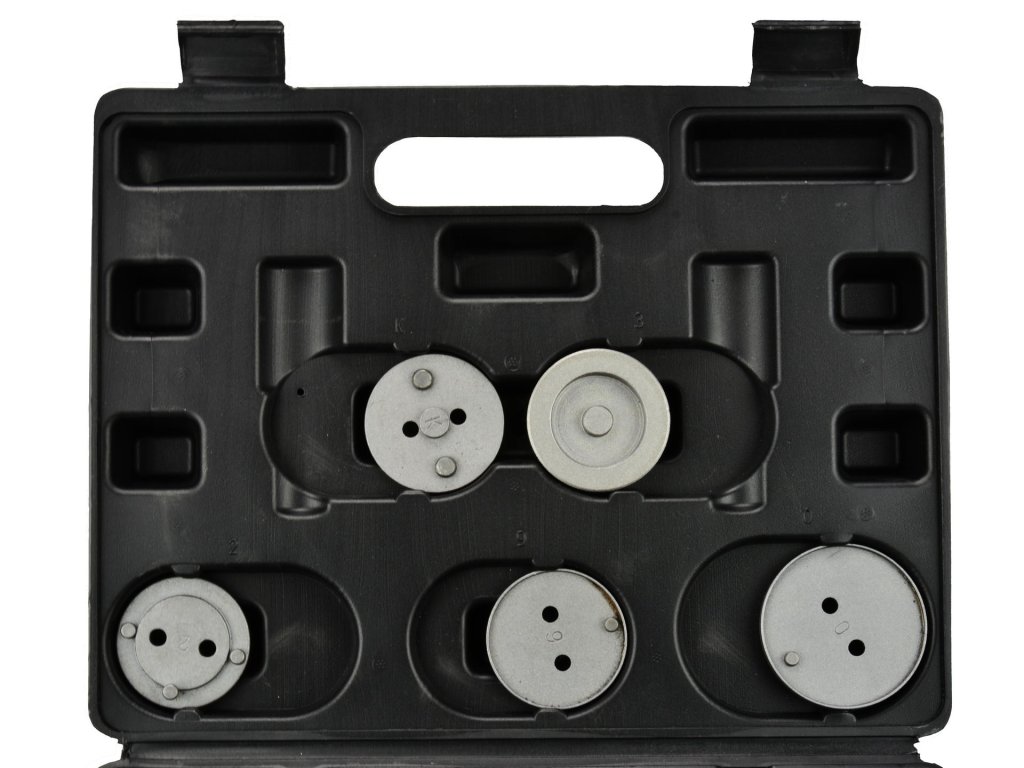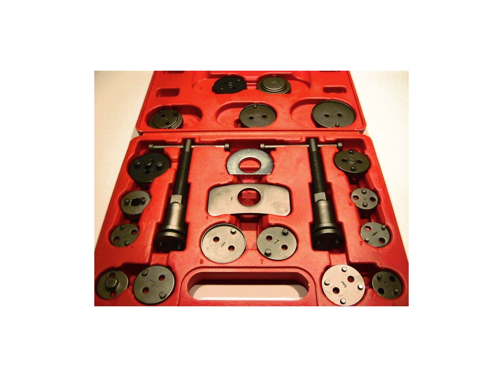 Univerzální souprava v plastovém kufříku se používá pro montáž a zpětné vracení pístů třmenu kotoučových brzd. Pomocí této sady snadno zatlačíme jak přední brzdové pístky, tak především zadní, které mají i šroubovici pro ruční brzdu, kdy je třeba na pístek zároveň tlačit i otáčet.