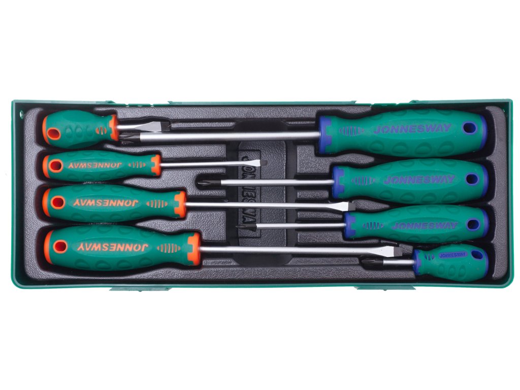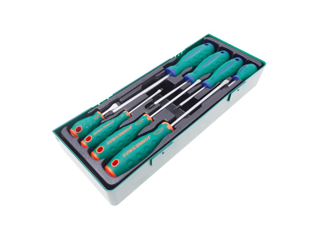 Plastový modul, rozměr 370 x 140 x 50 mm: Souprava 8 šroubováků, ploché a Philips (křížový) – JONNESWAY D71PP08SP