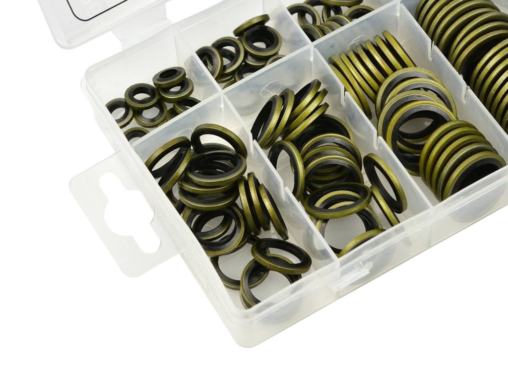 Ocelové/gumové těsnění (podložky) univerzální, velikosti M6-M26, sada 150 kusů – GEKO G03606