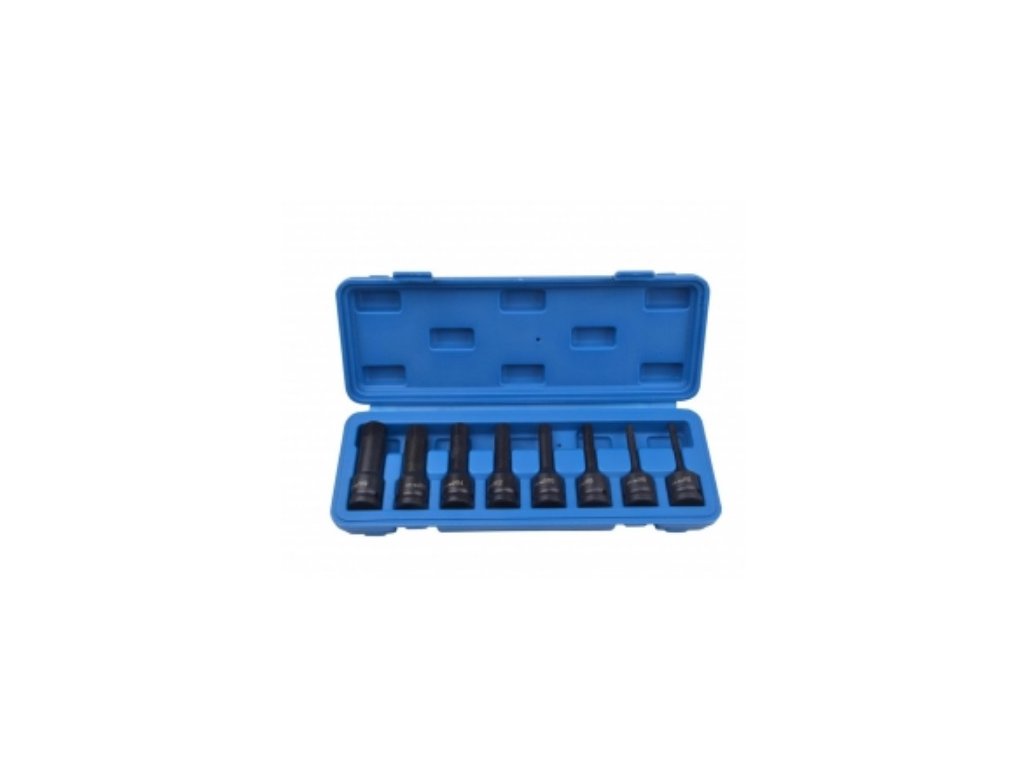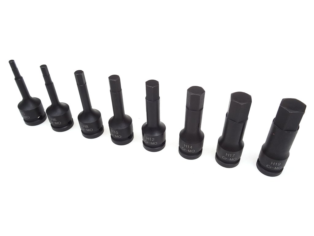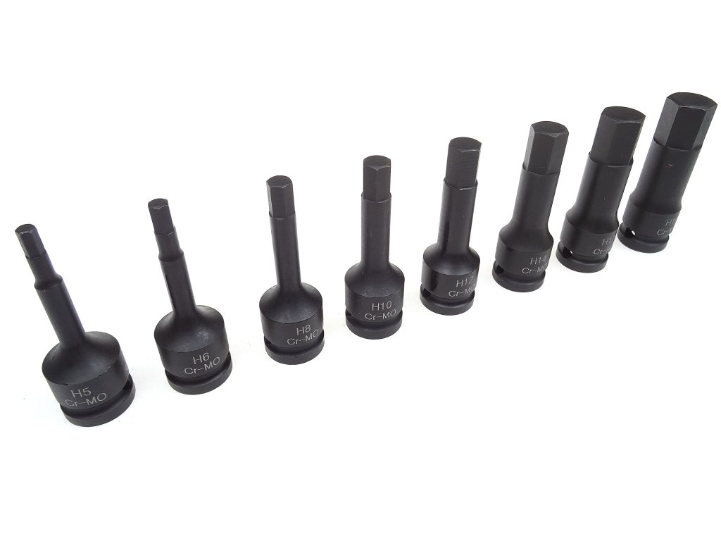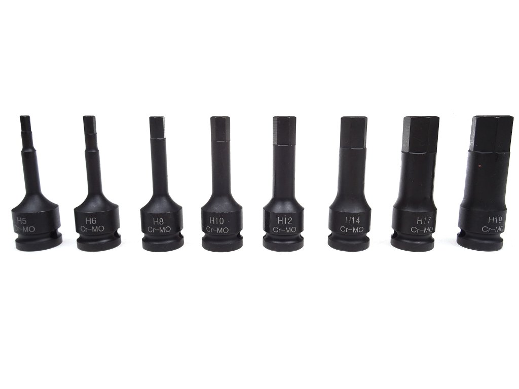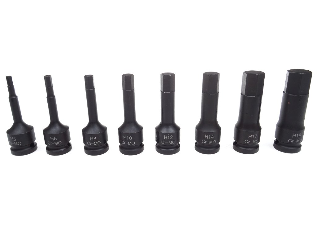 Praktická souprava osmi imbusových hlavic. Velikosti v sadě jsou H5, H6, H8, H12, H14, H17 a H19 (vyznačeno potiskem). Hlavice se usazují na 1/2” (12,5 mm) čtyřhran, tedy na klasické ráčny, vratidla nebo rázové povolováky a utahováky.