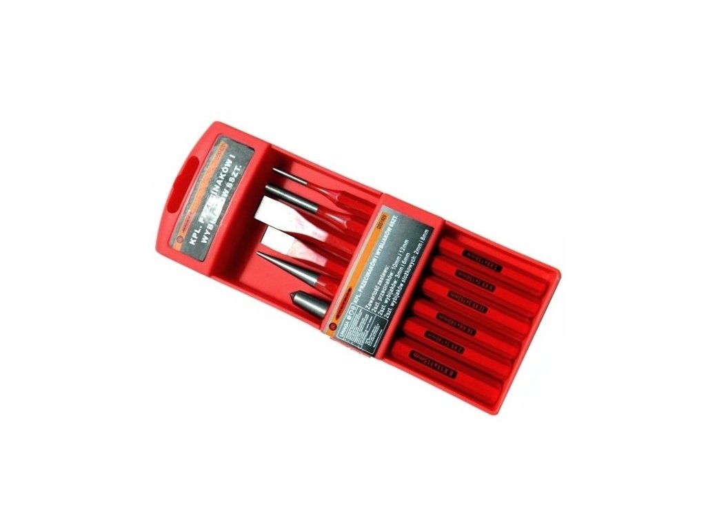 Sada sekáčů, vyrážečů a důlčíků – QUATROS QS51820 Obsah: 6 kusů. 2x sekáč (tzv. majzlík): 10 a 12 mm 2x vyrážeč: 3 a 6 mm 2x důlčík kuželový: 2 a 8 mm Souprava balena v praktické kazetě z tvrdého plastu.Doplňkové parametry