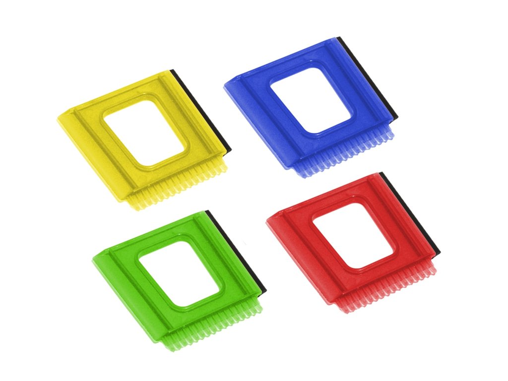 Plastová škrabka se třemi stranami (sníh, led, voda). Materiál plast, různé barvy.