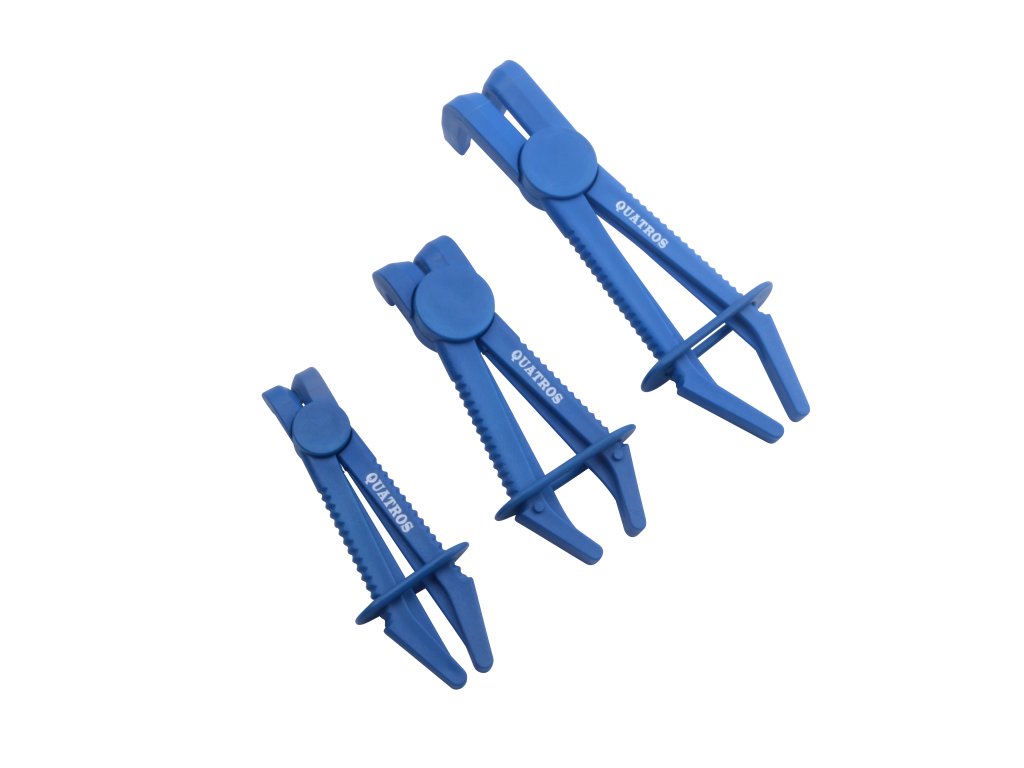Zahnuté škrtící kleště na hadice do průměru 60 mm, 3 kusy, plastové, s aretací – QUATROS QS14202.