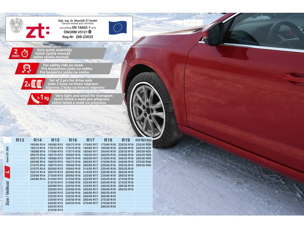 Textilní sněhové řetězy, s velmi rychlou a snadnou montáží, splňují evropské normy včetně v Rakousku vyžadované "ÖNORM V 5121".