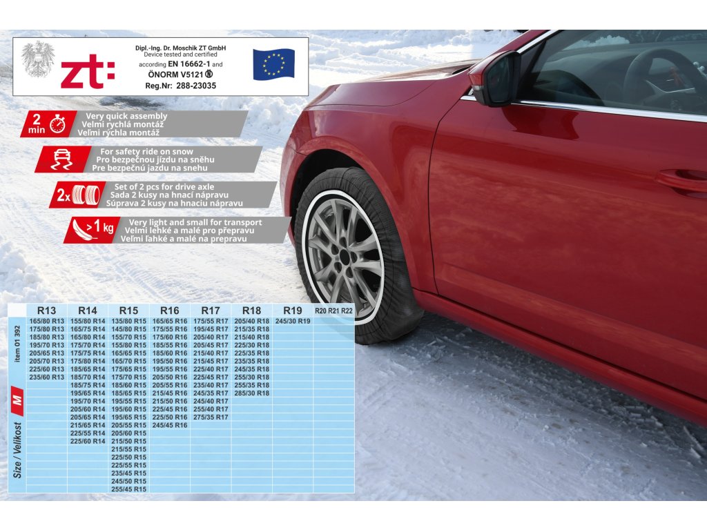 Textilní sněhové řetězy, s velmi rychlou a snadnou montáží, splňují evropské normy včetně v Rakousku vyžadované "ÖNORM V 5121".