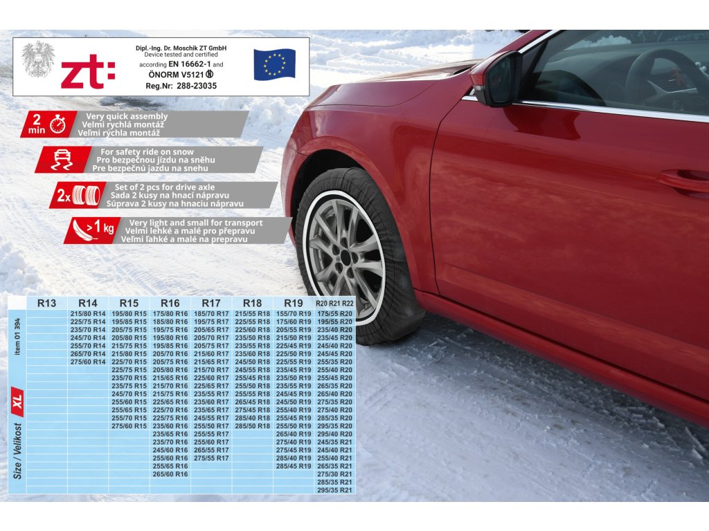 Textilní sněhové řetězy, s velmi rychlou a snadnou montáží, splňují evropské normy včetně v Rakousku vyžadované "ÖNORM V 5121".