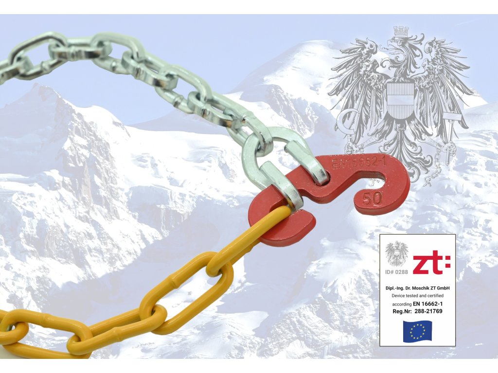 Sněhové řetězy, pro osobní vozidla do hmotnosti 1800 kg, splňující evropské normy včetně v Rakousku vyžadované "ÖNORM V 5117".